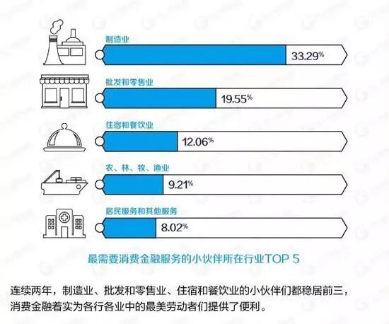 4、从行业占比来看,消费金融需求排名前五的制造业,批发零售业,农林牧渔,居民服务等占据了消费金融市场82.13%的份额。
