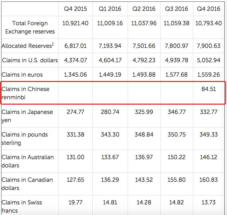 今年3月31日,国际货币基金组织发布了截至2016年12月的“官方外汇储备货币构成”季度数据。该数据扩展了货币范围,首次单独列出了人民币的持有情况。小编在报告中发现,参与“官方外汇储备货币构成”报告调查的成员国人民币外汇储备达845.1亿美元,占这些国家总外储资产的1.07%。