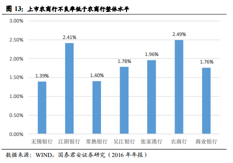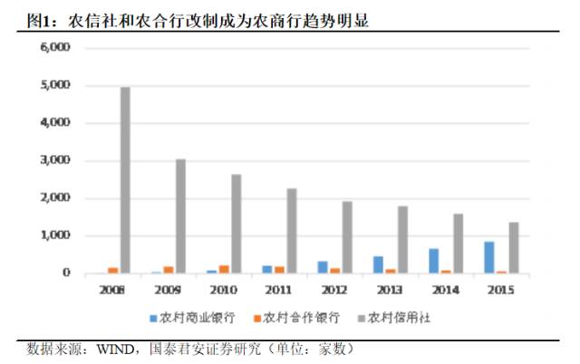 本报告主要分析标的为农村商业银行(农商行),但也会涉及农村合作银行(农合行)、农村信用社(农信社)等(统称为农村金融机构),会在文中指明。 农村金融机构是我国起步最早的金融机构之一,最早可追溯至1923年6月国内成立的第一家农信社,距今已近百年。长期以来,农村金融机构在弥补乡村金融服务空白、支持农民生产生活方面,可谓功勋卓著。但其管理、监管政策却几经周折,致使行业发展走了些弯路,直至2000年以后,开始组建符合现代企业制度的农村商业银行。 1.1.历史沿革 从建国前夕开始,为改善广大农村的金融服务和农民的生产生活,中央高层和各级人民政府高度重视农村金融工作。1951年5月,人行召开了第一次全国农村金融工作会议,决定大力发展农村信用合作社,以便帮助农村摆脱高利贷盘剥,同时也能为农民提供基本的结算、存款等金融服务。随后,全国各地开始组织农民成立农信社,其数量快速增加,截止1956年,农信社数量达到16万个,覆盖了全国80%的乡,使农村基层有了基本的金融服务。 在随后的几十年中,农信社的管理经历了“几放几收”的周折。“放”是指将农信社下放给人民公社、生产队管理,真正实现自主经营,这本身也是合作制的初衷,但由于当时客观条件并不具备,出现了一些混乱。“收”是指将管理权上收至国家银行,农信社成为了国家银行的基层机构,呈“官办化”倾向。 1979年2月,国家恢复中国农业银行,将农信社明确定位为“既是集体金融组织,也是国家银行(农业银行)在农村的金融机构”。1984年8月,国务院批转了中国农业银行《关于农村信用社管理体制改革的意见》,提出把农信社办成“自主经营、自负盈亏”的群众性合作金融组织。此时刚好适逢改革开放后的经济起飞,农信社成为支持当时乡镇发展的主力,自身也获得了高速发展,但也暴露一些风险。但1990年形势逆转,农信社管理权再次被上收,人行发布《农村信用合作社管理暂行规定》,提出“农村信用社由中国人民银行委托中国农业银行领导和管理”。 1996年,农信社与农业银行最后一次脱离行政隶属关系,回归“民办化”。当年8月,国务院下发了《关于农村金融体制改革的决定》,要求农信社与农业银行行政脱钩,业务改由县联社管理,人行履行监管职责。至年底全部完成平稳脱钩,农信社再次获得经营自主权。而后,各地开始探索组建市联社、省联社。2000年7月,国务院批准江苏省开展改革试点,组建省联社,并试办农村商业银行,首批三家(常熟农村商业银行、张家港农村商业银行、江阴农村商业银行)于2001年成立。2003年浙江试点了首家农村合作银行浙江鄞州农村合作银行。 2002年,人行在温州地区选择部分农信社开始利率改革试点,允许存贷款利率一定程度上浮,成为我国银行业利率市场化改革的先声。取得较好效果后,2003年开始向全国推广试点。利率提高后,一方面吸收存款有优势,另一方面,更高的贷款利率能够覆盖更高的信用风险,从而能够为中小微企业发放贷款。这使农信社在抢占当地存贷款市场上更具优势,市占率往往在当地银行业排名非常靠前。 随着我国城乡经济发展,以个人互助为核心目的的合作制已经不适应现代金融业发展需要。合作制是“社员入股、一人一票、服务社员”,是一种劳动的联合,适用于分散、弱小的个体劳动者间的互助。而股份制是一股一票,是资本的联合。2003年6月,国务院印发《关于深化农村信用社改革试点方案的通知》,开始重点鼓励符合条件的地区将农信社改造为股份制商业银行。同年8月,经国务院批准,吉林、山东、江西、浙江、江苏、陕西、贵州、重庆等8省市开始试点。随着改革推进,近年,农商行数量持续增加,而农信社、农合行数量快速下降。 2011年,银监会宣布不再组建新的农信社和农合行,全面取消资格股,逐步将符合条件的农信社改组为农商行,农合行则要全部改组为农商行。至此,周折几十年的农村金融机构发展改革历程,形成最终的定论,农商行成为重点发展的农村金融机构。 1.2.行业现状 截止2015年末,我国农商行数量为859家,农合行数量为71家,农信社数量为1373家。随着改制进度推进,后两类机构的数量还在持续下降,农商行数量继续增加,2016年底达到1055家。 截止2017年3月末,农村金融机构(含农商行、农合行、农信社、其他新农村金融机构等)的总资产规模为31.40万亿元,较上年末增长5.01%,占银行业金融机构总资产比例为13.20%。总负债29.14万亿元,较上年末增长5.13%,占银行业金融机构总负债比例为13.60%。资产负债规模的增速均高于商业银行全行业。从过去几年时间来看,农村金融机构的总资产占银行业金融机构的比例基本稳定,甚至有微弱提升。 截止2017年3月末,农商行的不良率为2.55%,高于整个商业银行业的1.74%,主要是历史原因所致,历史包袱仍然较重。其实从近年的增幅上,并没有体现出比全行业更差的情况。 农商行2016年9月末的拨备覆盖率、拨贷比分别为183.92%、5.04%,资本充足率为13.14%,均高于全行业水平。而且,值得注意的是,近几年全行业拨备覆盖率均在下降,而农商行的降速则低于全行业。另外,农商行的拨贷比近年还在明显上升。这显示出农商行抵御风险的能力在逐步加强,但消化历史包袱的压力仍然存在。 盈利水平方面,2017 年第一季度农商行 ROA 为 1.19%,高于全行业的1.07%,资产获利能力在全行业内属