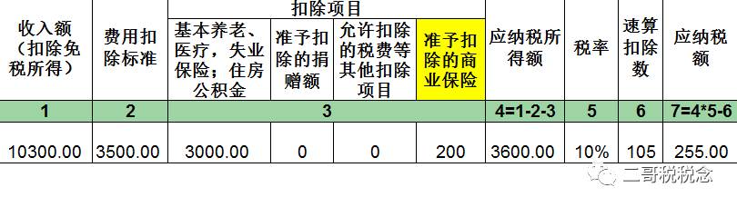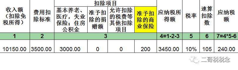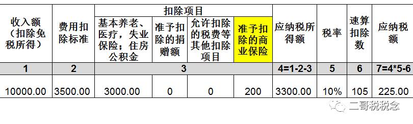 所以小A在8月收入额为10000,应纳税所得额为10000-3500(免税额)-3000-200(符合条件商业保险)=3300.按照速算扣除表,适用税率10%,速算扣除数105,8月小A应纳税额为3300*10%-105=225元。