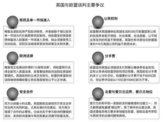 布鲁塞尔经济智库Bruegel高级研究员舒恩麦克(Dirk Schoenmaker)向新浪财经分析:“英国与欧盟的争议点,一直集中在移民劳工流动、单一市场准入、欧盟法律延续性、公民权利、分手费追讨、北爱避免出现硬边境及爱尔兰的和平统一等议题。其中,前三项是英国希望的谈判优先议题,后三项则是欧盟坚持的谈判前期主导话题。”
