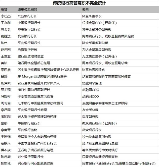 确实,据《证券日报》不完全统计,近两年从银行离职后投身互联网金融行业的银行高管不少于50人。而根据脉脉统计,其中去年上半年从银行跳槽的高管,就有30人。
