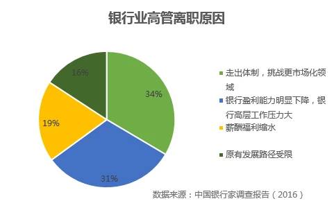 在对1794位银行家进行调研后,中国银行业协会联合普华永道在今年2月发布的《中国银行家调查报告(2016)》调查显示,希望“走出体制、挑战市场化领域”和“银行盈利能力明显下降,银行高层工作压力大”是银行家辞职的两大原因。