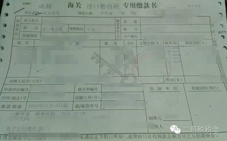 注意:海关缴款书的开具日期,填开之日的次日起15天内缴纳税款,超过15天期限的,自期限届满之日起按日加收税款的万分之五的滞纳金。如果期限届满之日为周六周日或法定节假日的,顺延到第一个工作日