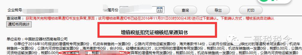 注:2017年2月13日起增加缴款单位信息比对后,对于双抬头缴款书,由于只准显示一个企业的纳税人识别号,因此对于委托方来说由于不是直接向海关交税的,而是有代理方缴纳,那么缴款书上只会显示代理方的纳税人识别号,这种情况下委托方进项采集比对时也可能出现比对不符的结果,出现这种情况就需要向税局申请异常数据核对。