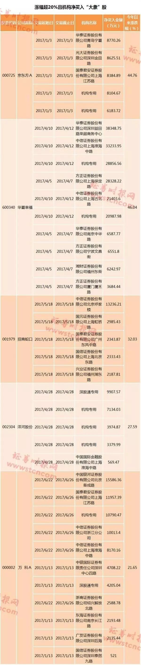 梳理今年以来的龙虎榜数据发现,市值超千亿元的个股中,剔除掉借壳上市的顺丰控股之后,京东方A、华夏幸福、招商蛇口、洋河股份以及万科A等5股年内涨幅超20%:京东方A上涨44.76%,华夏幸福上涨46.04%,招商蛇口上涨32.03%,洋河股份上涨27.59%,万科A上涨21.65%.