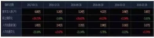 另一方面,从贵州茅台的股东总人数来看,从2016年2月29日至2017年3月31日,其持股总人数自3.85万户一路震荡走高到6.80万户。伴随着近一年多贵州茅台股价的大幅拉涨,其总体筹码分布反而呈现出显著分散的特征——持股的投资者不仅没有抱团,反而呈现出毋庸置疑的分散。