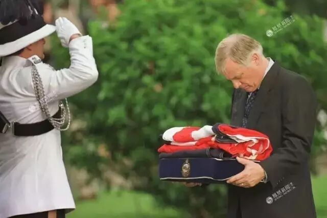 7、1997年6月30日,告别仪式上,彭定康从仪仗队员手中接过英国国旗。