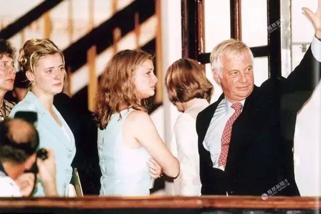 5、1997年6月30日,“末代港督”彭定康一家步出港督府,开始告别仪式。彭定康在1971年与林颖彤结婚及育有3女,前排左起为彭洁思,彭丽思和彭雅思。