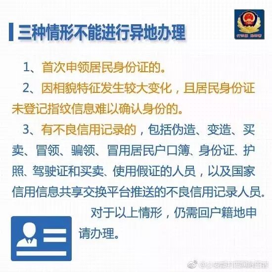 7月1日起,公安部将在全国范围实施#身份证异地受理#、挂失申报和丢失招领工作。提醒:①首次申领居民身份证的 ②因相貌特征发生较大变化,且身份证未登记指纹信息难以确认身份的 ③有不良信用记录的 三种情形不予受理异地办理申请。身份证使用、办理提示↓↓