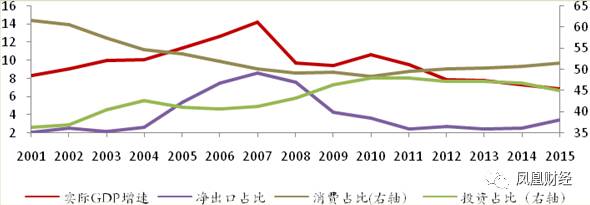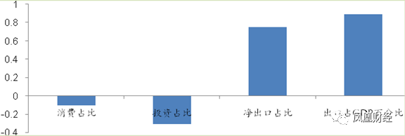 2001-2016年间,与出口占比相比,同期消费、投资、净出口占比与GDP增速的相关性仅为-0.11、-0.31和0.74,而消费、投资和出口实际增速与GDP增速相关性为0.43、0.54和0.48,出口占比与GDP增速的相关性最高(0.89)。
