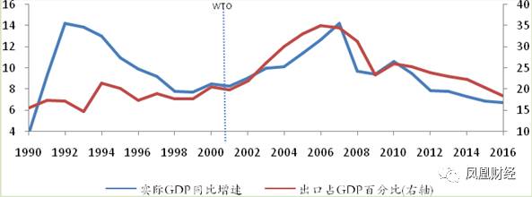 图 1:2001年后实际GDP增速与出口贸易占GDP比重高度同步(年度)