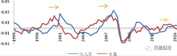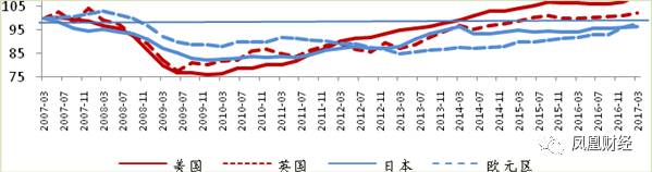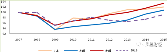 从历史数据看,美国经济周期领先于其他发达国家。下图显示出美国GDP的短期波动长期领先欧元区的经济波动。虽在07年金融危机中,全球主要发达国家同时在2009年跌入谷底,表现出高度的同步性。但随后的缓慢复苏过程仍然呈现出美国领先的特点。美国于2013年勉强恢复到2007年的人均GDP水平,从此逐渐走出次贷危机泥潭。随后日本、英国和欧盟缓慢跟随,经济环境相继回暖。