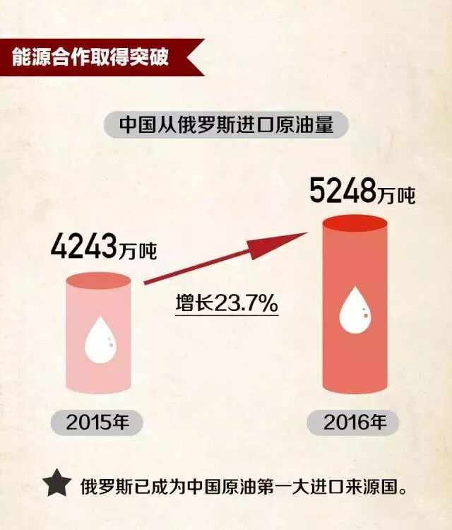 统计显示,2016年,中国从俄罗斯进口石油5230万吨,同比增长23.4%,使俄罗斯超过沙特,成为中国的第一石油输出国。2017年6月份,中俄东线天然气管道中国境内段正式开工,建成后年输气量将达380亿立方米,成为继中俄原油管道之后两国间的第二条能源战略通道,进而在扩大贸易额的同时,使得中俄两国可以不断加大油气合作深度。