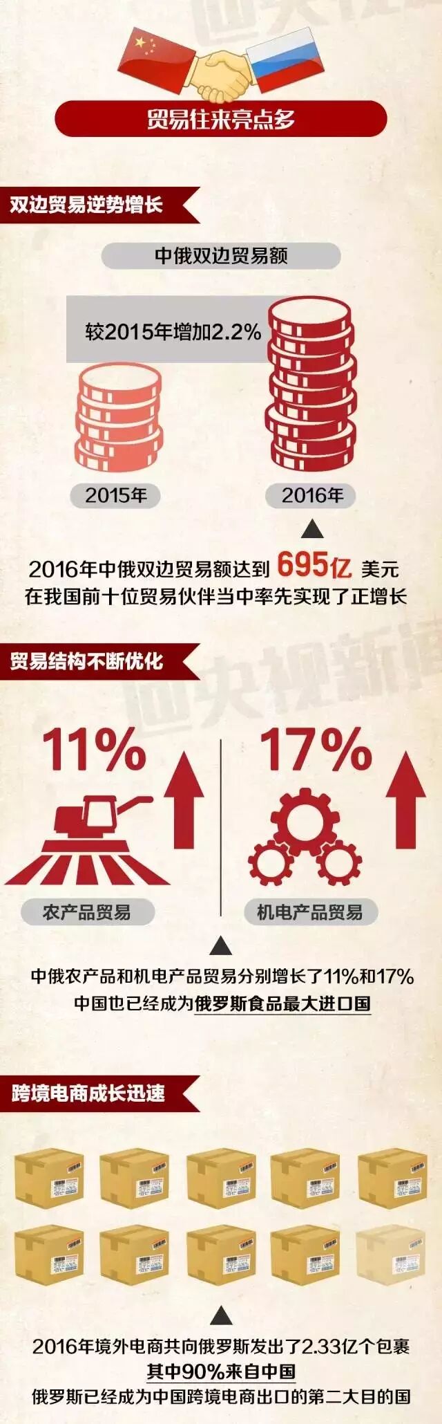 截至目前,中俄贸易仍然保持回升势头。据统计,今年前5个月,中俄双边贸易额达到2231亿元人民币(约328亿美元),同比增长33.7%。除了传统领域外,高新技术产品、农产品进出口表现亮眼,困扰中俄贸易多年的结构问题持续缓解。2016年,中国机电产品对俄罗斯出口额同比增长30%以上,其中高新技术产品出口比重已达到60%。