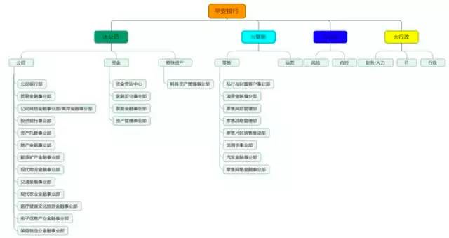 2016年下年,随着平安银行新管理层的更替,该行也启动了组织架构的调整。以零售转型为主,目标是向扁平化、去行政化转型。平安银行总行一级部门从此前的42个精简到30个,总行架构调整为大公司、大零售、大内控、大行政四大条线。