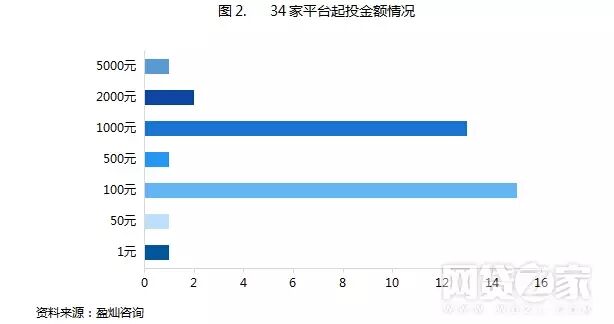 与散标相比,投资人投资自动投标产品的资金需要分散到多个借款项目中,因此自动投标产品的起投金额要高于散标的起投金额。平台自助投标产品的起投金额主要集中在100元、1000元这两档,起投金额为100元的有15家,起投金额为1000元的有13家,2000元以上的有3家。