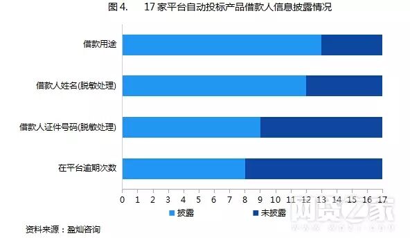 平台自动投标产品的投向基本上都是小额个人借贷借款标,因此这里仅对借款人为自然人的信息披露项进行分析。对17家已经公布自动投标产品借款人信息披露情况进行分析,并不是所有的平台都公布了脱敏处理后的借款人姓名,有些平台公布的借款人名称并不是真实的借款人姓名,而是在平台的注册名称;一半的平台公布了脱敏处理后的借款人证件号码,借款人在平台的逾期情况较少平台愿意公布。