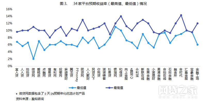 平台自动投标产品种类比较多,预期收益率的范围也比较广,同一平台不同期限的自动投标产品对应的预期年化收益率不同,与散标类似期限越长,对应的预期收益率也越高,如融金所24个月期的自动投标产品预期年化收益率可以达到13.8%,12月期的自动投标产品的预期年化收益率为12%,1月期的自动投标产品的预期年化收益率则为8.5%,可以明显的看出产品期限越长对应的收益率也越高。平台自动投标产品的预期收益率的收益率波动幅度较大,如下图所示,预期收益率波动的范围在2%-14%之间。