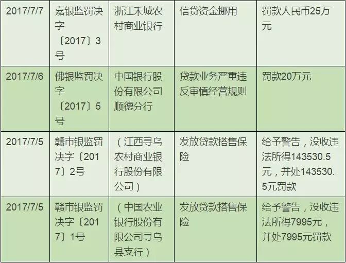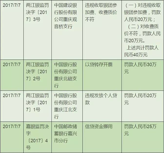 7月4日,银监会网站公告两江银监分局、佛山银监分局等银监分局行政处罚信息13份。罚款金额合计247万元。 处罚事由包括:违反审慎经营规则、票据业务违规、违法发放贷款、乱收费、信贷资金挪用、发放贷款搭售保险等。 具体如下: