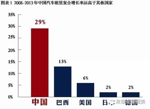 中国汽车租赁市场发展仍处于早期阶段。市场汽车租赁渗透率(租赁汽车数量占乘用车总保有量的比例)较欧美成熟市场明显偏低。罗兰贝格数据显示,2012年,中国租车渗透率仅为0.4%,明显低于日本(2.5%)、美国(1.6%)、韩国(1.4%)、和巴西(1.3%)。目前在国内,个人租赁市场基本未开放,即使是汽车租赁公司车队,租赁渗透率也不到10%,且客户基本为外企;而在德国、法国等成熟市场,每年近50%的汽车租赁公司车辆会以租赁形式出售。因此,中国汽车租赁市场渗透率存在巨大的提升空间。