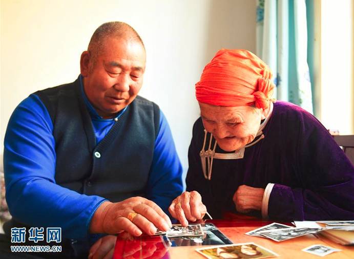 都贵玛(右)和她曾抚养过的扎拉嘎木在翻看老照片