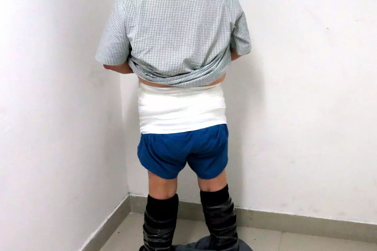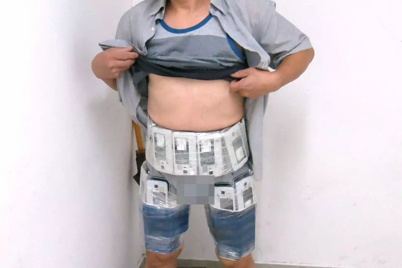这些绑藏案件的当事人以中年男性为主。当事人大多将手机等电子产品用保鲜膜、胶带缠在一起,然后绑在腰腹部以及大腿、小腿等部位,每人绑在身上的手机动辄二三十斤重——这么重的东西缠绕在身上,走起路当然没那么轻松,随之破绽百出。