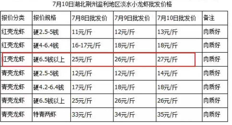 所幸,7月12日,价格暴涨的势头已经停止,昨日大部分地区的塘口价和市场批发价都出现了小幅下滑,同样以湖北监利为例,昨日硬6.5钱以上的红壳龙虾已回落至26元/斤,但后续会降多少目前不得而知。