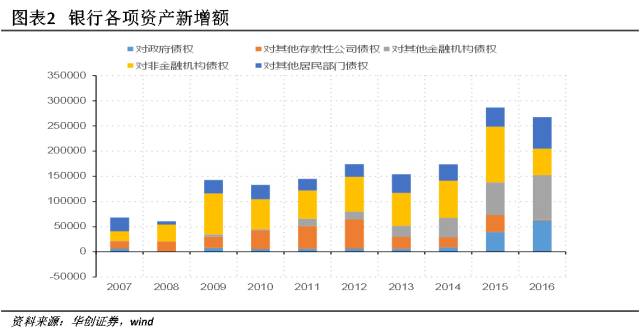 2015年至今,银行总资产增长脱离社融和M2增速“独自繁荣”。2016年M2和社融增速分别为11.3%和11.7%,而同期银行总资产扩张15.7%。M2和社融分别从负债端和资产端统计金融体系的信用创造及其对实体经济的信用支持,银行的资产扩张与两者都出现背离,看似金融正脱离实体“空转”,但考虑到银行借道对非银债权和对政府债权实现的信贷投放,上述增速缺口并不存在。