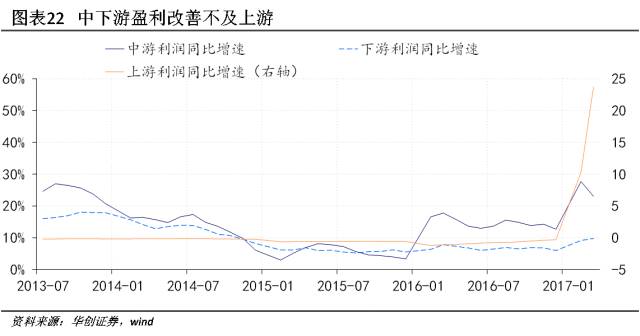 信用风险可能更多来自定价能力不足的中下游领域。当然,与2014年不同的是,PPI转正具有重要的金融含义,工业企业盈利和政府财政收入都同步明显改善,上市公司财务数据也显示企业偿债能力正在提高,大规模信用风险爆发的可能性显著下降。但进一步拆分结构,中下游企业盈利受到成本挤压改善有限,信用事件的发生可能更多来自定价能力不足的中下游领域。