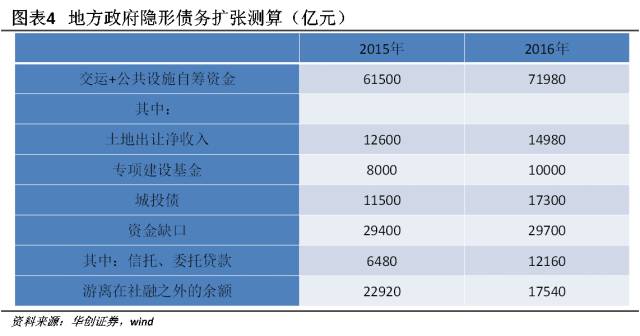 游离在社融之外的地方政府隐性债务扩张约为4万亿。我们主要从基建资金缺口的角度来估算隐性债务扩张的规模,并和大资管的资金投向数据交叉验证。具体来说,先从基建投资完成额中扣除预算内基建支出、土地出让净收入、城投债净融资和新增基建类贷款,假定城投平台可用于投资的自有资金有限,那么余下的资金缺口只能通过收/受益权、信托贷款等非标融资和PPP来筹集。根据我们的估算,2015年至今,基建的非标、PPP融资额为5.8万亿,其中已纳入社融统计的信托、委托贷款约为1.6万,游离在现有社融统计之外的约为4万亿。