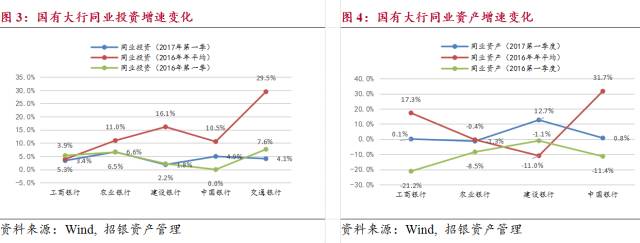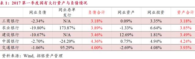 从表1的2017年第一季度国有大行资产负债扩张情况来看,五大行总资产规模与五大行负债合计成正比,保持正增长,平均增长3.53%。说明在金融去杠杆的背景下,大行资金面仍较为宽松,负债端保持稳定增长,有一定的配置需求,不过在同业投资受监管约束增长有限的情况下,同业资产成为短期内的重点配置方向。
