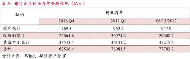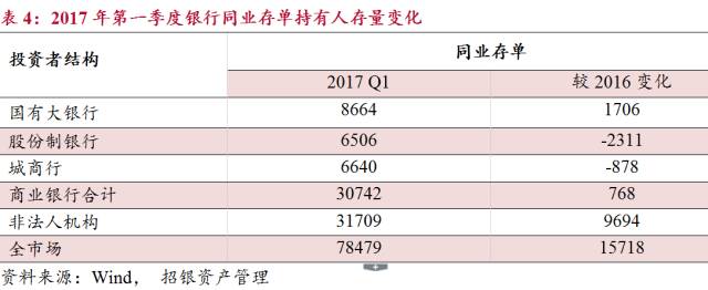 国有大行获取资金成本较低,一直有资产配置需求。特别在金融去杠杆过程中,资金回流大行,资产端将会有较强的资产配置需求。今年一季度,国有大行的同业存单持有量大幅上升1706亿,总持有量达到8664亿。预计资金回流过程中,大行将会持续2017年第一季度对同业存单的增持,未来国有大行有望成为同业存单主要的持有机构。