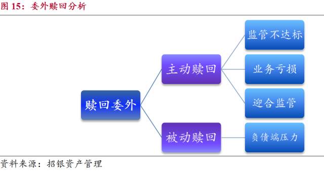 部分机构对于委外的主动赎回主要出于两种考虑,一是因为不符合近期监管要求,对未来强监管的担忧情绪引发的对委外的主动赎回;二是因目前市场下行,部分机构委外业务业绩不达标,甚至出现亏损,该类机构不得不对其进行主动赎回;三是为了迎合监管主动赎回。