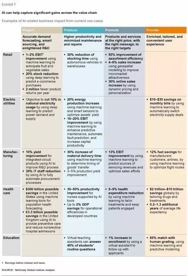 早期的证据表明,AI可以为其重度采用者提供真正的价值,并且具有强大的破坏性力量。在麦肯锡的调查中,早期的AI采用者将强大的数字能力与前瞻性的策略相结合,实现了较高的利润率,并将在未来拉大与其他公司的业绩差距。本报告在零售业、电力公司、制造业、医疗保健和教育方面的案例凸显了AI在改进预测和渠道,优化和自动化运营,发展有针对性的市场营销和定价,以及改善用户体验方面的潜力。