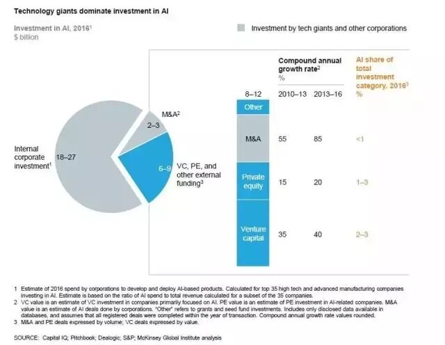 AI投资正在快速增长,主要的主导者是一些数字巨头公司,例如谷歌和百度。在全球范围,麦肯锡估计科技巨头们在2016年投资AI的金额约200亿美元至300亿美元,其中90%用于研发和部署,10%用于AI并购。风险投资(VC)和私募股权投资(PE),投资捐赠和种子投资也在迅速增长,从非常小的基数迅速增长到总共60亿美元至90亿美元的规模。机器学习作为一种支持基数,在内部和外部投资中都占据了最大份额。