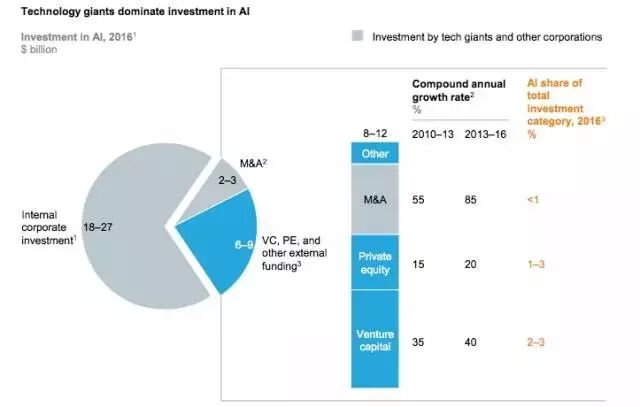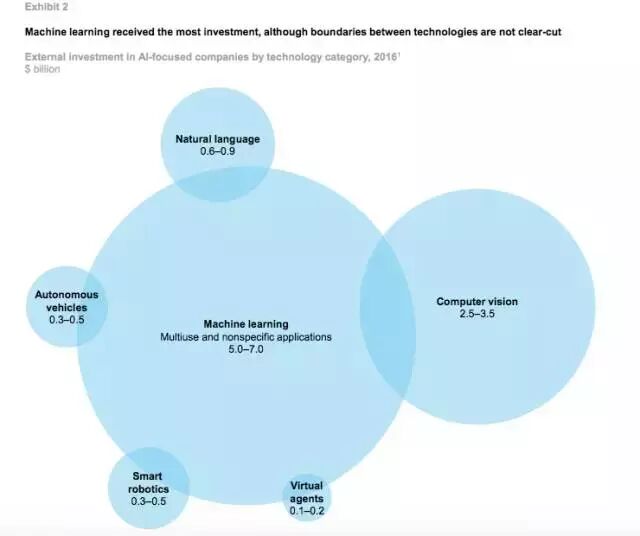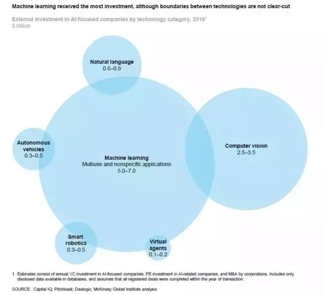 麦肯锡估计,2016 年,AI 的年度外部投资总额在 80 亿到120 亿之间,机器学习吸引了其中近60%的投资。