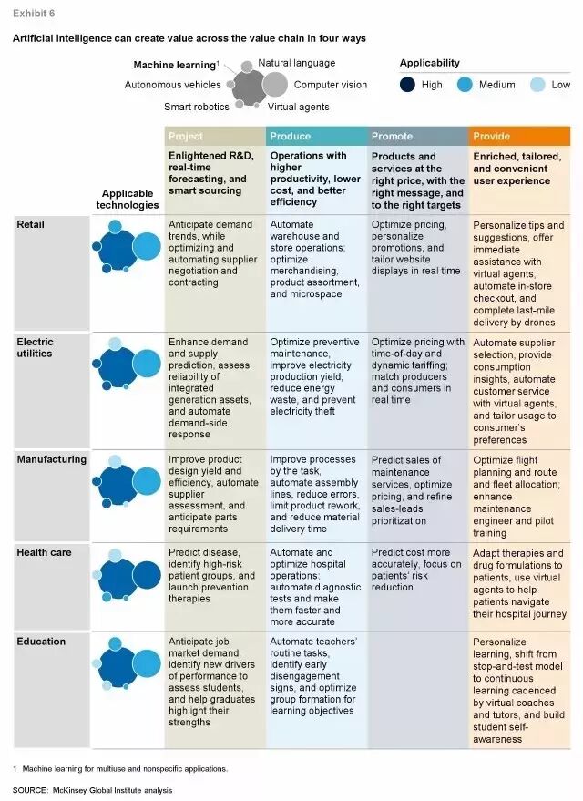 麦肯锡的研究报告把AI创造价值的方式分成4类:使公司更好地预测需求、优化研究和改进采购(Project);提高公司以更低的成本和更高的质量生产产品和提供服务的能力(Produce);以恰当的价格、恰当的信息和正确的目标客户促进产品销售(Promote);以及提供丰富、个性化和方便的用户体验(Provide)。如下表所示: