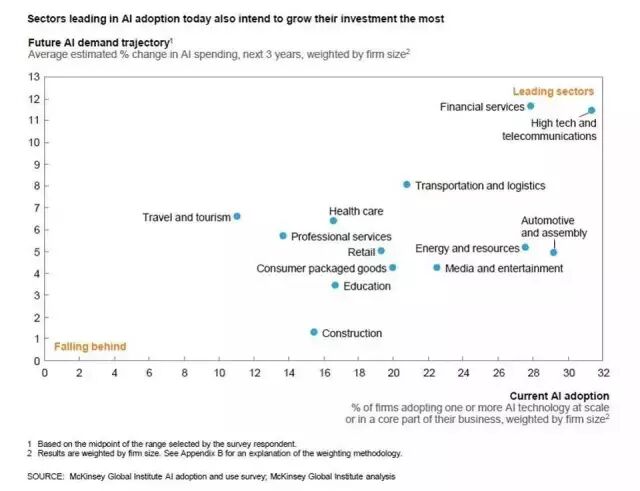 目前AI 投资率是2013 年以来外部投资增长的 3 倍。麦肯锡发现,自觉采用 AI 技术的公司中,有20%是早期采用者,集中在高科技/电信,汽车/装配和金融服务行业。下图显示了研究小组在分析过程中发现的趋势。