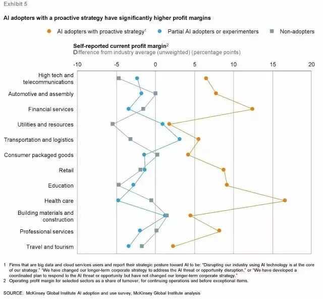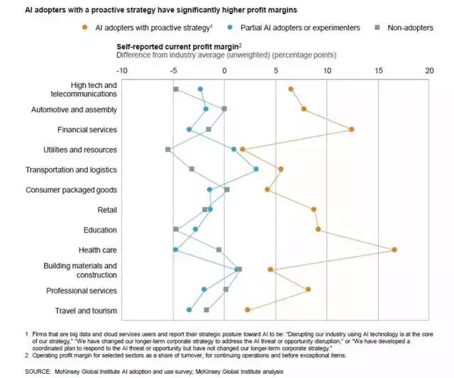医疗、金融服务和专业服务在采用 AI 技术后,利润取得了最快增长。麦肯锡发现,受益于高级管理人员支持人工智能的公司已经投资基础设施,来支持其规模,并有明确的业务目标,要提高3%至15%的利润率。在接受调查的3000 多名商业领袖中,大多数人预计未来一年的利润率将增长5%。