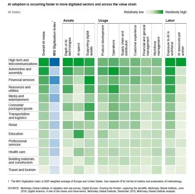 高科技、电信和金融服务是机器学习和AI 技术的早期采用者。这些行业因为愿意投资新技术而获取竞争力和内部高效流程而闻名。许多创业公司也开始关注这个领域。MGI 数字化指数(MGI Digitization Index)是欧洲和美国的国内生产总值加权平均数。麦肯锡还创建了一个总人工智能指数,在下面第一栏中显示,对AI 可做出贡献的 KPI 进行了比较,覆盖了资产、用途和劳动力。接下来的图,按行业和资产、用途及劳动力类别显示了AI 的相对采用水平。