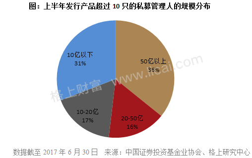 此外,上半年共备案私募产品12610只,较去年同期增长15.42%,其中证券类私募产品6398只,占比50.74%。据格上研究中心数据显示,今年备案证券类私募产品超过10只产品的私募管理人共81家,其中管理过规模超过50亿的私募占比超过35.80%。值得注意,在今年备案证券类产品超过10只的私募管理人中,管理规模在10-50亿区间内的中型私募占比仅为33%,相较其他规模类型的管理人其在新产品备案上出现明显滞缓。