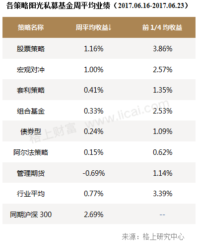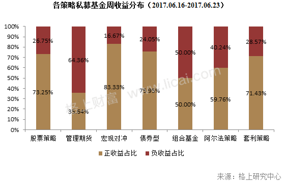 从各策略的业绩表现来看,上周(2017.06.16-2017.06.23)除管理期货以外,所有策略全部获得正收益,且股票策略获得最高的周度收益,为1.66%,其中正收益占比高达73.25%。仅管理期货策略收益为负值(-0.69%),且正收益占比仅为35.64%。