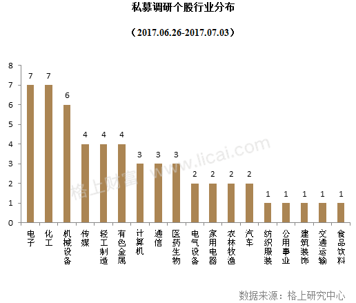 据格上研究中心统计,在私募机构调研的个股中,本周对中小企业板的关注度仍旧最高为44.44%,较上周同比增长3.7%,而创业板和主板的关注度分别为38.89%和16.67%。行业方面,电子和化工行业为本周私募关注焦点,均有7家上市公司接受调研。