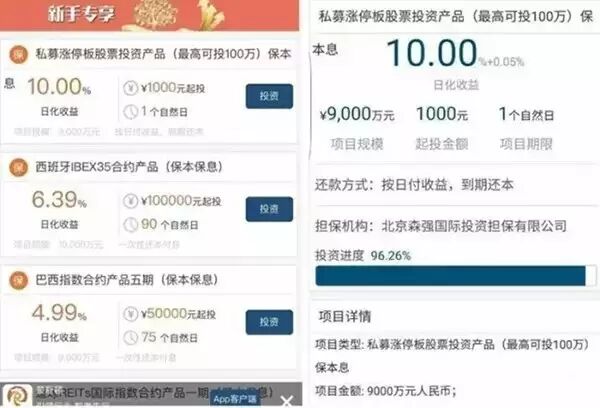 该公司的产品包括“沪深股票组合产品活动标”、“韩国指数合约产品三期(保本保息)”等多款投资项目,利期3-90天,起投金额从1000到2万不等,日化收益率3.85%-10%。