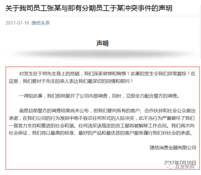 而在昨日晚间,捷信在其公众号“捷信头条”发布声明称,对此事表示哀悼和惋惜,将全力配合警方的调查。在公司行为准则中不允许任何形式的人际冲突,违反该规定的员工都将被解除工作合同。