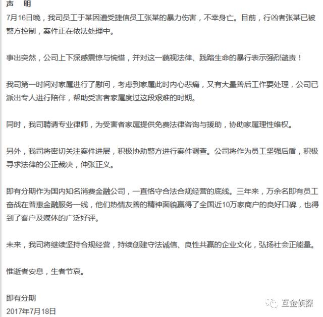 7月16日晚,其员工于某因遭受捷信员工张某的暴力伤害,不幸身亡。目前,行凶者张某已被警方控制,案件正在依法处理中。