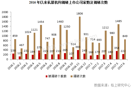 格上研究中心数据显示,私募机构调研热情本月有所回落,6月走访上市公司222家,不及5月的354家,环比增下降37.29%;共计调研849次,较5月(1485次)下降42.87%。