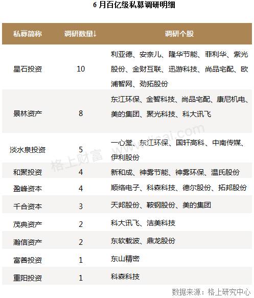 从数量上看,百亿级私募6月调研热情也相对降温,共计调研上市公司40家,环比上月下跌56.04%。星石投资6月调研仍在走访个股数量上位居第一,共走访了10家上市公司,而景林资产同样积极,走访了8家上市公司,位列第二。(百亿级私募调研详情见附表)