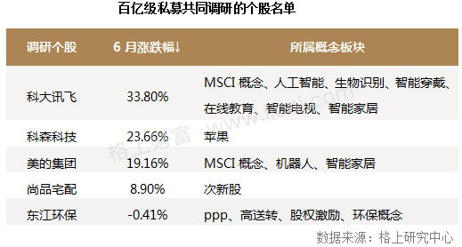 同时,格上研究中心注意到,在6月没有出现三家以上百亿私募共同关注个股,但是在私募共同关注个股名单中,MSCI概念、智能家居概念频繁出现。